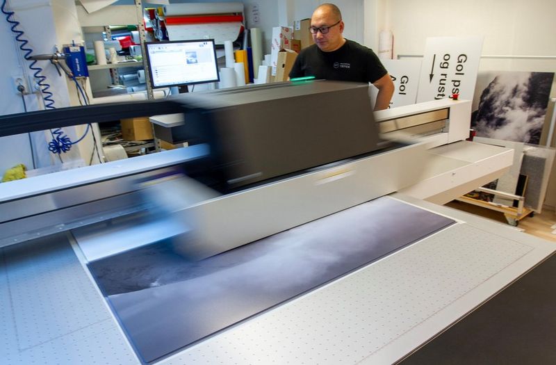 Print av fotokunst var medvirkende for investeringen i flatbedprinter fra øverste hylle. Operatør Thomas Tønnessen sørger for at fotograf Terje Bjørnsens fotografier fra Hallingskarvet kan leveres kjøperne med høyeste fotokvalitet på aluminium.