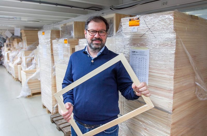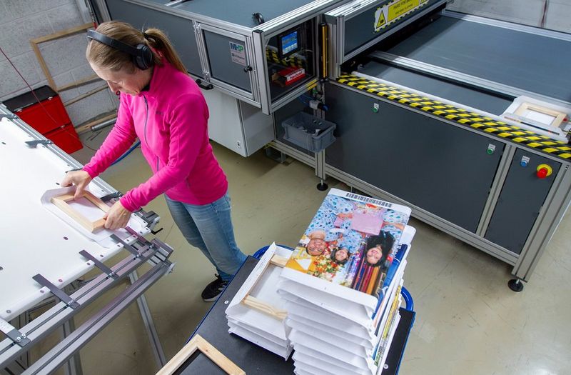 Gelato-produksjon for privatkkunder. Lerretsbildene kommer rett fra Colorado og skjæremaskinen, og festes til blindrammer i Nordens eneste automatiserte maskin for dette.