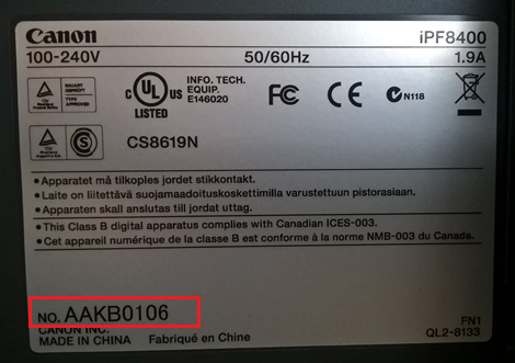 Serienummeret for din imagePROGRAF iPF-skriver vil være en kombinasjon av åtte tall og bokstaver.