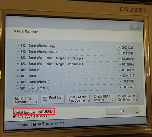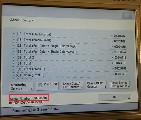 • Serienummeret for imageRUNNER vil være en sekvens av åtte alfanumeriske tegn.