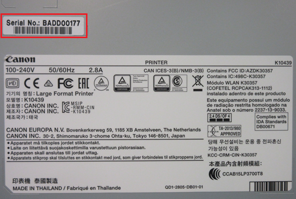 Serienummeret for imagePROGRAF TM-serien består av ni alfanumeriske tegn.