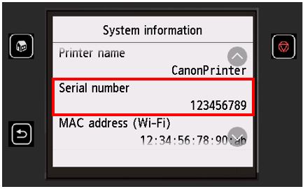 Du kan finne serienummeret ved hjelp av [123]-knappen eller på en etikett på maskinen, som forklart i instruksjonene nedenfor.