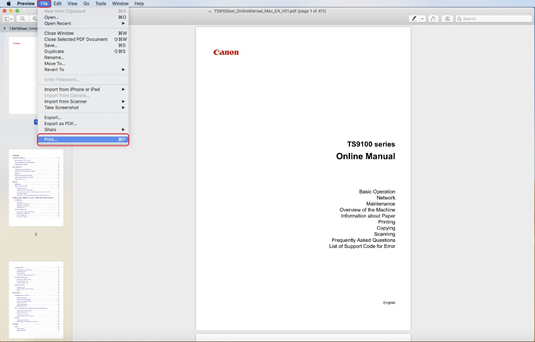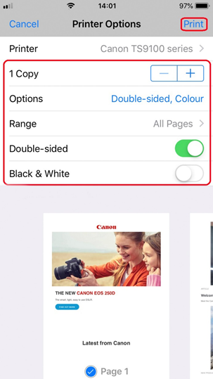 ] (avhengig av utgaven av iOS du har installert) for vise menyalternativene. Naviger deretter til og trykk på ikonet [Print] (Skriv ut).