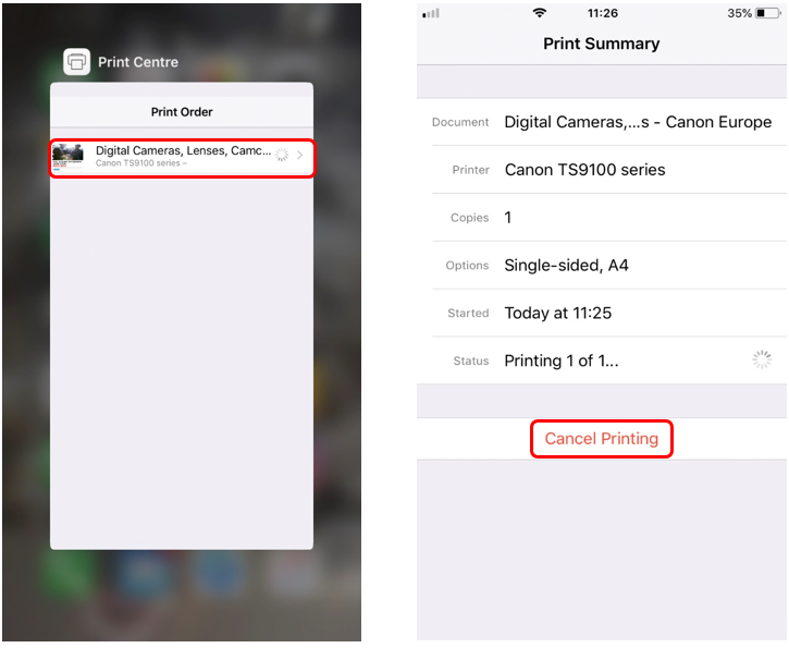 Bruk en av de to følgende metodene for å slette en utskriftsjobb med AirPrint: