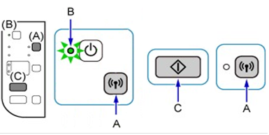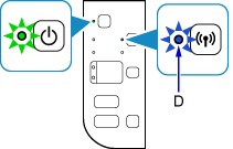 3. Trykk på knappen [Black] (Sort) (C) og deretter knappen [Wi-Fi] (A). Kontroller at Wi-Fi-lampen (D) blinker raskt, og at ON-lampen lyser som vist i illustrasjonen nedenfor. Deretter går du til tilgangspunktet og trykker på knappen [WPS] innen to minutter.