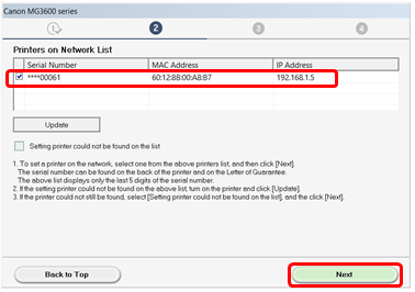 11. Hvis du allerede har koblet skriveren til nettverket, velger du den fra listen over skrivere på nettverket og klikker på [Next] (Neste) for å starte installasjonen av programvaren. Gå deretter videre til trinn 17. Hvis dette er første gang du konfigurerer skriveren din, vises den ikke i listen. Gå derfor videre til trinn 12.