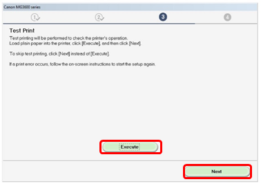 20. Klikk på [Execution] (Utfør) hvis du vil utføre en testutskrift for å bekrefte installasjonen. Du kan også klikke på [Next] (Neste).