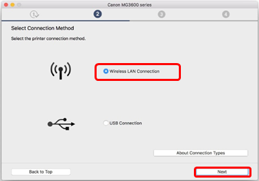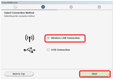 7. Velg [Wireless LAN Connection] (Trådløs LAN-tilkobling), og klikk deretter på [Next] (Neste).