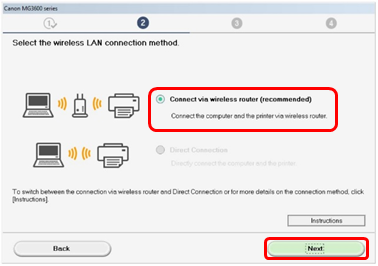 8. Velg [Connect via wireless router (recommended)] (Koble til via trådløs ruter (anbefalt), og klikk deretter på [Next] (Neste).