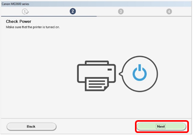 9. Kontroller at skriveren er slått på, og klikk deretter på [Next] (Neste).
