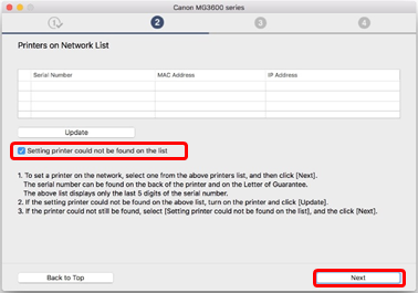 12. Kontroller at [Setting printer could not be found on the list] (Skriveren som blir konfigurert, ble ikke funnet i listen) er valgt, og klikk deretter på [Next] (Neste).