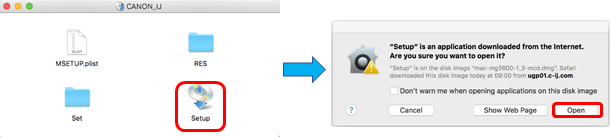 1. Dobbeltklikk på den nedlastede *.dmg-filen for å åpne skjermbildet nedenfor. Dobbeltklikk på ikonet [Setup] (Konfigurasjon) for å starte konfigurasjonen, og klikk deretter på [Open] (Åpne).