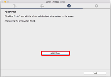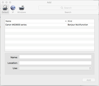24. Vent til Canon IJ Network er registrert, og velg deretter skriveren med Canon IJ Network oppført under kolonnen Kind (Type), og klikk på [Add] (Legg til).