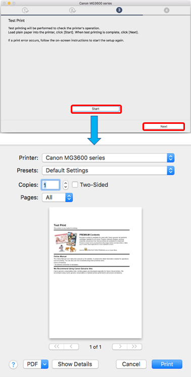28. Klikk på [Start] hvis du vil utføre en testutskrift for å bekrefte installasjonen. Du kan også klikke på [Next] (Neste).