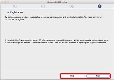 23. Registrer skriveren ved å klikke på [Next] (Neste) (åpnes i et nettleservindu). Du kan også klikke på [Skip] (Hopp over).
