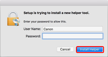 3. Når følgende skjermbilde vises, skriver du inn passordet, slik at hjelpeverktøyet kan installeres, og deretter klikker du på [Install Helper] (Installer hjelper).