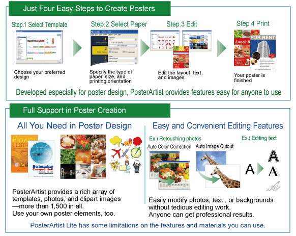 Programmet er en versjon av PosterArtist med begrenset funksjonalitet. Følgende funksjoner er ikke tilgjengelige i PosterArtist Lite: